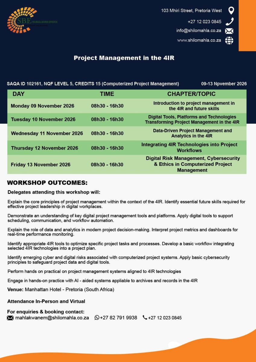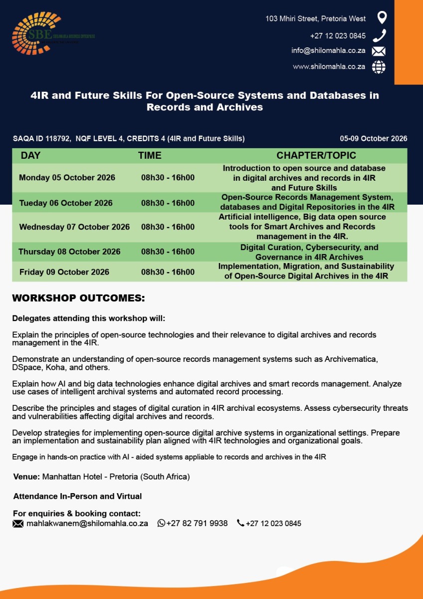 SBE offers the following workshops and trainings: Basic Application of Artificial Intelligence in the Fourth Industrial Revolution: Digital – Government, Digital – Administration and Digital – Management, Artificial intelligence in Information and knowledge Management in the Fourth Industrial Revolution, Artificial Intelligence for Metadata Services in Libraries in the Fourth Industrial Revolution, Artificial Intelligence for Information Services in the Fourth Industrial Revolution, Fourth Industrial Revolution and Future Skills for Management of Digital Archives and Records in the Intelligent Age, Fourth Industrial Revolution and Future Skills for Management of Digital Libraries and Information Services in the Intelligent Age, Digitalization of Archives and Records in the Fourth Industrial Revolution, Fourth Industrial Revolution and Future Skills for Open-Source Systems and Databases in Libraries and Information Services, Fourth Industrial Revolution and Future Skills for Open Systems and Databases in Records and Archives, Management and Administration of Libraries and Information Services in the Digital Age, Cybersecurity for Digital Library Systems and Databases in the Fourth Industrial Revolution, Cybersecurity for Digital Archives and Records Management Systems and Databases in the Fourth Industrial Revolution, Management of Smart Museums in the Fourth Industrial Revolution, Cybersecurity for Health Information Systems and Databases in the Fourth Industrial Revolution and Management of Electronic Records and Archives: From Manual, Electronic to Digital Records.